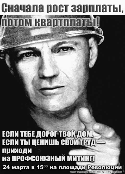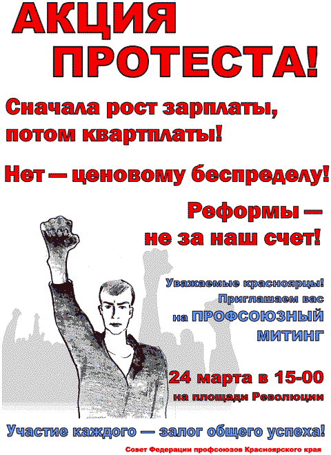 В ходе подготовки к акции протеста 24 марта Федерация профсоюзов края столкнулась с неожиданными трудностями. Так, одна из красноярских типографий, приняв заказ на печать агитационной продукции профсоюзов для митинга, на следующий день категорически отказалась его исполнять. Как объяснил директор типографии, им “настоятельно рекомендовали не печатать данную продукцию”. Кто и почему, он, конечно, не растолковал.