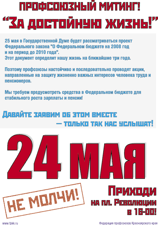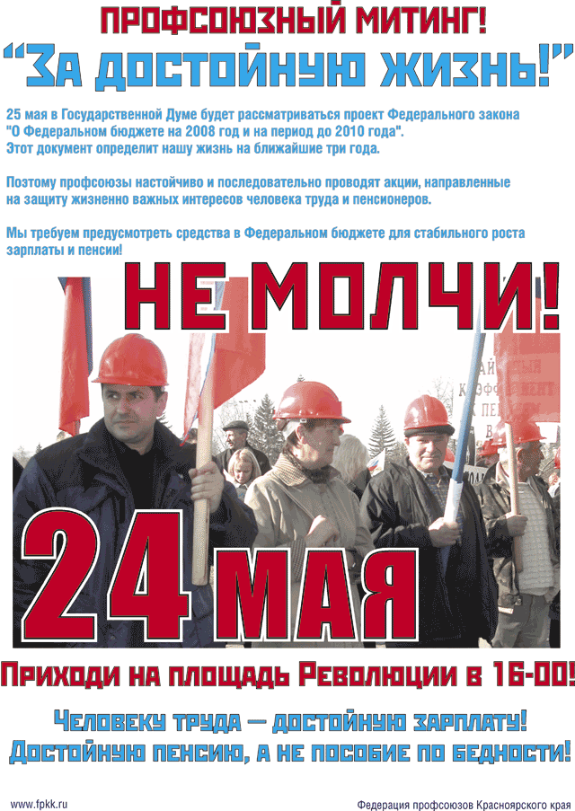 24 мая в Красноярске профсоюзы края планируют провести на пл. Революции в 16-00 митинг под лозунгом "За достойную жизнь!". Митинг состоится накануне рассмотрения в Государственной Думе в первом чтении проекта Федерального закона "О Федеральном бюджете на 2008 год и на период до 2010 года". Очень важно добиться включения в принимаемый бюджет обеспечения финансирования выдвинутых профсоюзами требований в ходе предыдущих акций.